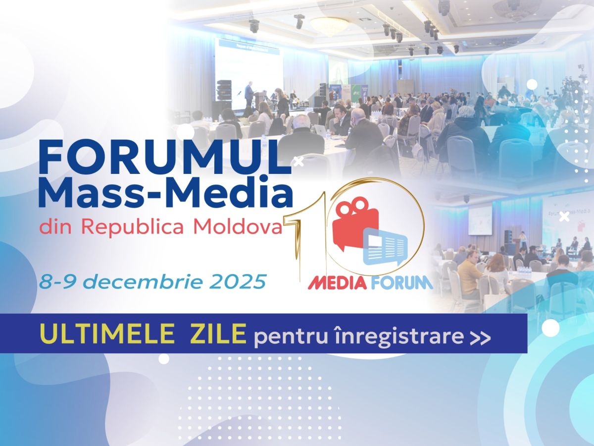 Jurnaliştii, editorii, redactorii, managerii şi alţi colaboratori ai instituţiilor mass-media din Republica Moldova mai au la dispoziție doar trei zile pentru a transmite solicitări de înregistrare la cea 10-a ediție a Forumului Mass-Media care va avea loc pe 8–9 decembrie 2025 la Chișinău. Înregistrarea prealabilă este obligatorie și se încheie pe 30 noiembrie 2025. În rezultatul înregistrării online, organizatorii vor selecta circa 150 de participanți la Forum.