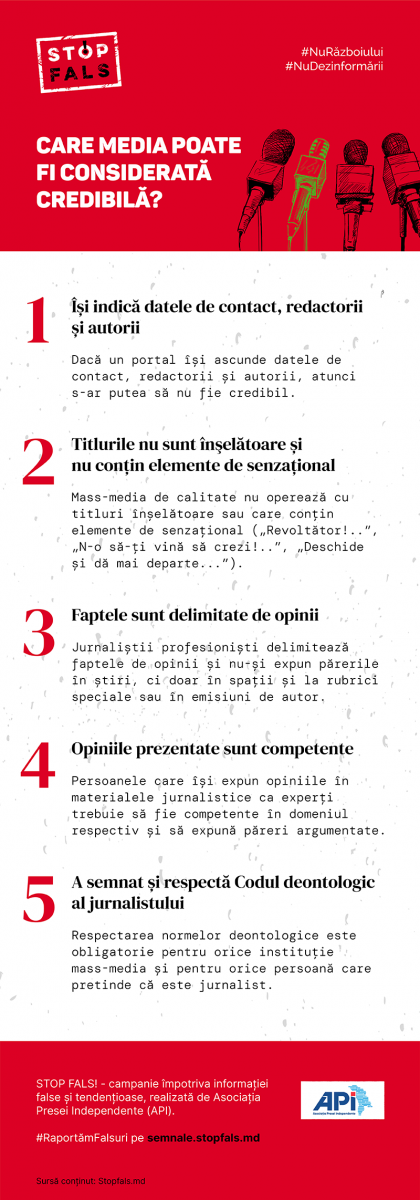 STOP FALS! - campania împotriva informației false și tendențioase, realizată de Asociația Presei Independente (API), descrie în infograficul de mai jos care instituții media pot fi considerate credibile. #NuRăzboiului #NuDezinformării