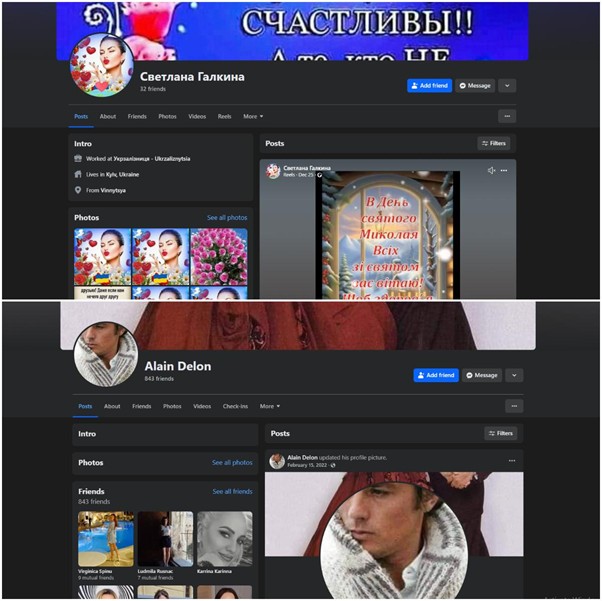 Angela Angela, de exemplu, este un profil de Facebook care prezintă semne clare că nu reprezintă o persoană reală și ar trebui tratat cu precauție. Profilul nu conține informații personale relevante sau detalii despre viața reală a utilizatorului, cum ar fi locul de muncă, educația sau alte informații specifice. Un alt indiciu este că imaginea de profil și alte fotografii par să fie luate de pe internet, fără a reflecta o identitate reală. Contul are puține postări, fără o interacțiune autentică cu alți utilizatori. Mai mult, câțiva dintre „prietenii” Angelei sunt, la rândul lor, conturi false. Spre exemplu, contul Светлана Галкина, care are o activitate incoerentă și interacțiune zero cu alți utilizatori. Tot în lista de prieteni ai Angelei am găsit și contul… faimosului actor și regizor francez Alain Delon, cu o imagine de profil preluată de pe internet, informații despre viața reală lipsă și o listă de prieteni, preponderent femei. Și acest cont este fals.