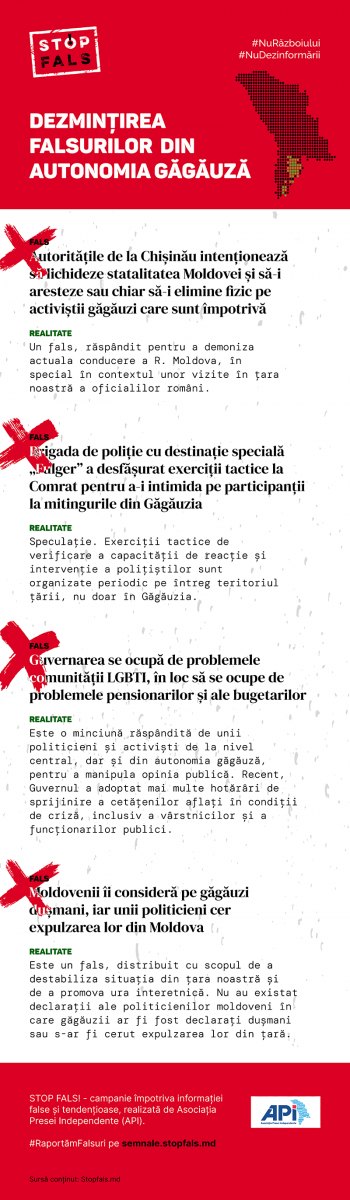 STOP FALS! - campania împotriva informației false și tendențioase, realizată de Asociația Presei Independente (API), descrie în infograficul de mai jos câteva din cele mai virale falsuri în UTA Gagauz Yeri, dar și dezmințirea acestora. #NuRăzboiului #NuDezinformării