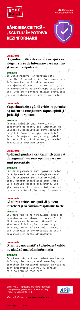 STOP FALS! - campania împotriva informației false și tendențioase, realizată de Asociația Presei Independente (API), descrie în infograficul de mai jos câteva atu-uri ale gândirii critice în combaterea dezinformării și explicațiile de rigoare. #NuRăzboiului #NuDezinformării