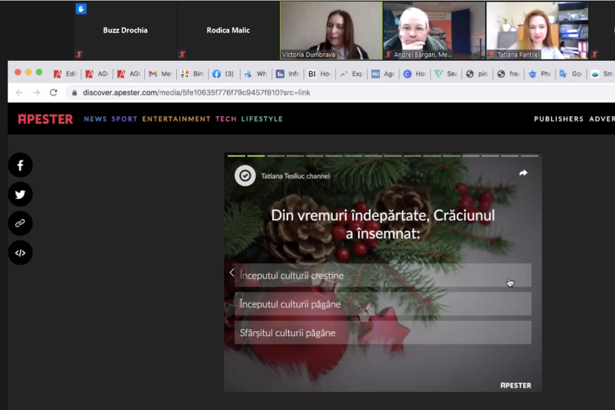 GIF-uri, quiz-uri sau teste, video-uri, cartoane, infografice – sunt câteva din elementele multimedia tot mai des utilizate de platformele media de la noi. Aceste elemente transmit mesajele mai eficient și mai rapid, captează atenția vizitatorilor site-urilor și a utilizatorilor rețelelor sociale și îi fac „să petreacă” mai mult timp pe platformele media. Cum se creează un quiz, GIF și cum se editează fotografii și video-uri interactive au învățat jurnaliștii de la șapte redacții regionale la o instruire online, desfășurată de Asociația Presei Independente (API) la 15 și 22 decembrie 2020, în cadrul proiectului „Presa locală profesionistă – conținut de calitate pentru cetățeni”, finanţat de Ambasada SUA în Republica Moldova.