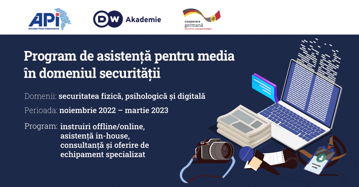 Asociația Presei Independente (API) și DW Akademie (Germania) anunță lansarea Programului de suport și instruire pentru instituțiile mass-media în domeniile securității fizice, psihologice și digitale. La program se pot înscrie redacțiile (posturi TV și radio, ziare și portaluri de știri) care produc și publică conținut jurnalistic de interes public și cu respectarea principiilor deontologice.