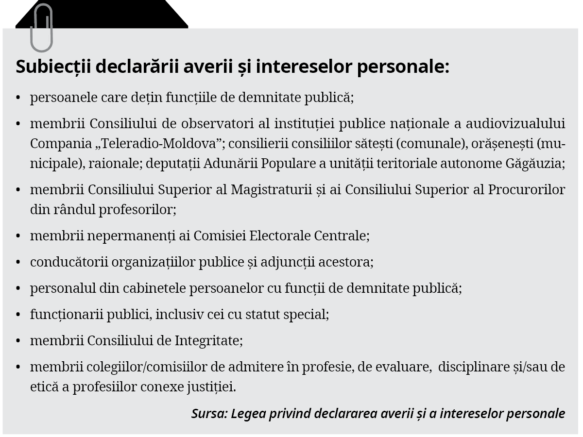 Potrivit Legii privind declararea averii și a intereselor personale, subiectul declarării este obligat să-și declare averea și interesele personale și ale familiei sale (soţul/soţia, copilul minor, inclusiv cel adoptiv sau persoana aflată la întreţinere). Totodată, aceștia sunt obligați să declare și averea concubinului/concubinei dacă se află în concubinaj. Potrivit aceluiași act legislativ, se prezumă că au calitatea de concubin/concubină persoanele care, pe parcursul anului fiscal precedent, au locuit împreună cel puțin 183 de zile.