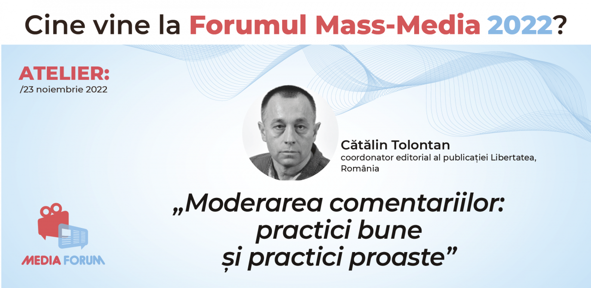 Moderarea comentariilor la articolele publicate pe site-uri și rețele sociale este subiectul atelierului „Moderarea comentariilor: practici bune și practici proaste” cu participarea jurnalistului Cătălin Tolontan, coordonator editorial al publicației Libertatea. Cătălin este unul dintre cei mai cunoscuți jurnaliști din România, cu o experiență în presă de circa 30 de ani, autor al unor investigații jurnalistice de mare impact care au generat „cutremure” în unele sisteme de administrare a treburilor publice din România.