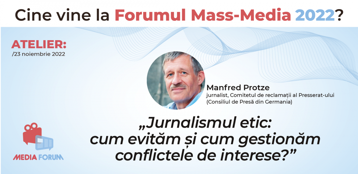 Puterea mass-media stă, în primul rând, în credibilitatea ei și îi obligă pe jurnaliști la un comportament etic. Este datoria jurnalistului să păstreze credibilitatea redacţiei pentru care lucrează, a lui însuși și, prin aceasta, a întregului corp profesional. „Jurnalismul etic: cum evităm și cum gestionăm conflictele de interese?” este tema atelierului moderat de jurnalistul Manfred Protze de la Comitetul de reclamații al Presserat-ului (Consiliul de Presă din Germania). Manfred a lucrat redactor de știri la Agenția Germană de Presă timp de 33 de ani și este membru al Presserat din 1987. În această perioadă, a fost implicat în soluționarea a circa 20.000 de reclamații.