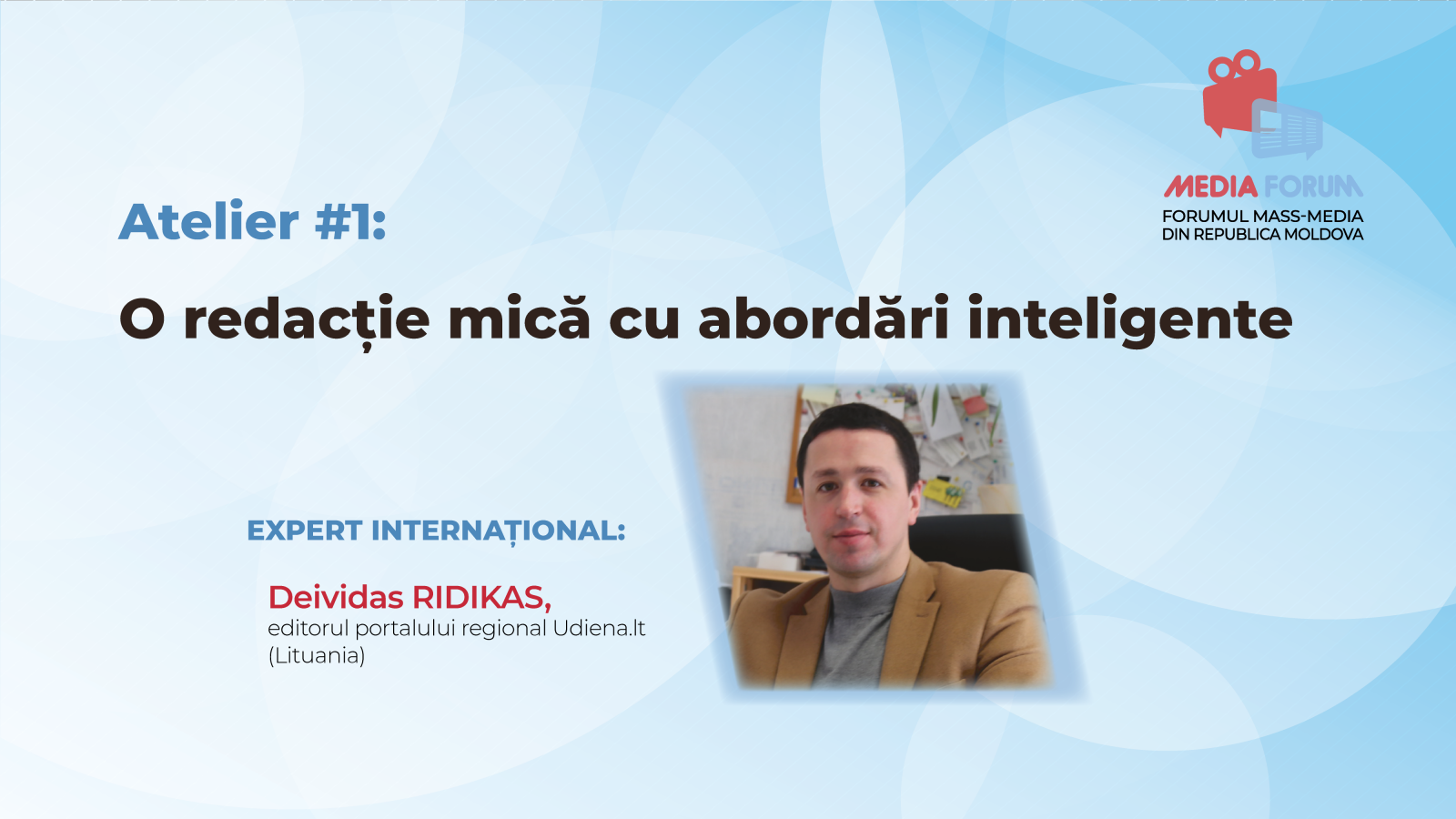 La primul atelier, „O redacție mică cu abordări inteligente”, editorul lituanian Deividas Ridikas va povesti cum o redacție mică poate reuși să-și extindă auditoriul, îndepărtându-se de modelul clasic de business mediatic și implementând soluții inovative și inteligente în activitatea de zi cu zi. Deividas are experiență în jurnalism de peste 14 ani, este editorul portalului regional Udiena.lt din Lituania și administrează o agenție de publicitate și o companie de distribuție de ziare și produse promoționale.