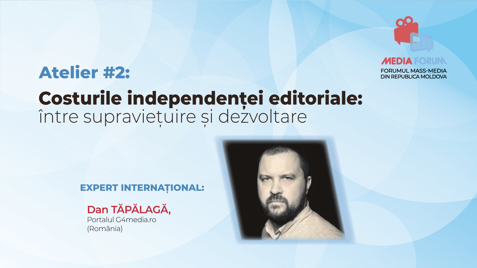 Dan Tăpălagă este expertul din România care va facilita al doilea atelier „Costurile independenței editoriale: între supraviețuire și dezvoltare” la care se va vorbi despre provocarea instituțiilor media de a-și păstra independența editorială în condițiile în care piața de publicitate este denaturată de o concurență neloială și de un cadru de reglementare slab dezvoltat. Dan este jurnalist, cofondatorul portalului G4Media.ro. A activat ca jurnalist la Radio România Actualități, Radio Europa Liberă și BBC, a predat cursuri de jurnalism politic la Facultatea de Jurnalism din Sibiu, Facultatea de Jurnalism și Științele Comunicării a Universității din București și la Centrul pentru Jurnalism Independent din România.