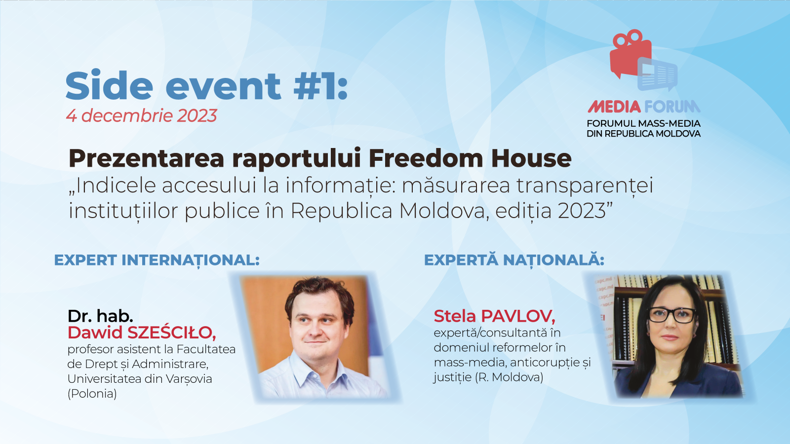 Al treilea an consecutiv, reprezentanța din Moldova a organizației internaționale Freedom House elaborează și prezintă la Forumul Media o analiză comprehensivă a gradului de transparență a instituțiilor publice din țara noastră. Ediția 2023 a „Indicelui accesului la informație: Măsurarea transparenței instituțiilor publice în Republica Moldova” va fi prezentată de experții Dawid Sześciło și Stela Pavlov. Dr. hab. Dawid Sześciło este profesor asistent la Facultatea de Drept și Administrare a Universității din Varșovia (Polonia), expert în cadrul mai multor organizații internaționale și autor al peste 200 de publicații academice în domeniul administrației publice, dreptului administrativ și drepturilor omului. Stela Pavlov este expertă/consultantă în domeniul reformelor în sectorul mass-media, anticorupție și justiție pentru Consiliul Europei, PNUD, Soros Moldova, Freedom House și în proiecte finanțate de UE.