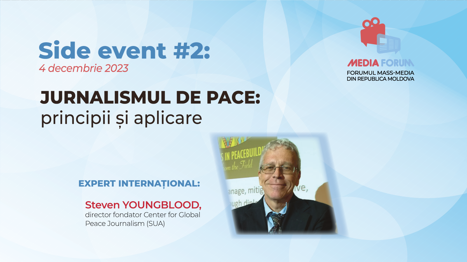 Jurnalismul de pace: principii și aplicare – este tema celui de-al doilea eveniment special cu participarea expertului din Statele Unite ale Americii, Steven Youngblood, director fondator al Center for Global Peace Journalism (SUA) și profesor universitar la Park University, Missouri. S. Youngblood editează revista „The Peace Journalist” și blogul „Peace Journalism Insights”, este autorul cărții „Principii și practici în jurnalismul de pace”. Pe parcursul carierei sale, a organizat și predat seminare și ateliere la tema jurnalismului de pace în 45 de țări ale lumii.