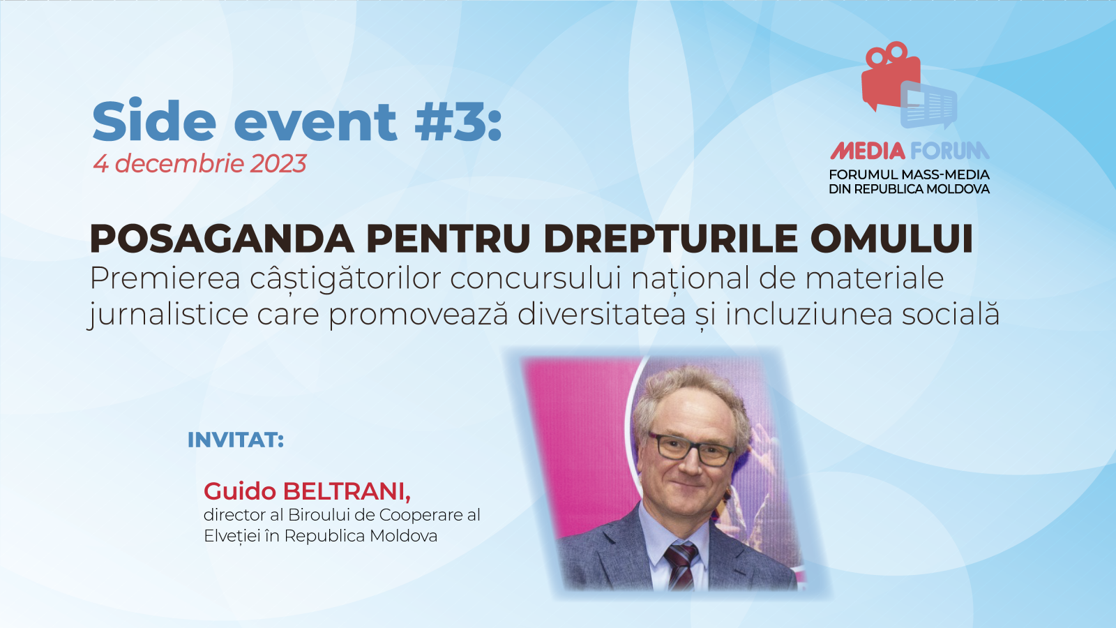 Câștigătorii ediției a doua a concursului național de materiale jurnalistice care promovează diversitatea și incluziunea socială vor fi premiați la un alt eveniment special, intitulat sugestiv „Posaganda pentru drepturile omului”. Trofeul concursului va fi înmânat de Guido Beltrani, directorul Biroului de Cooperare al Elveției în Republica Moldova.