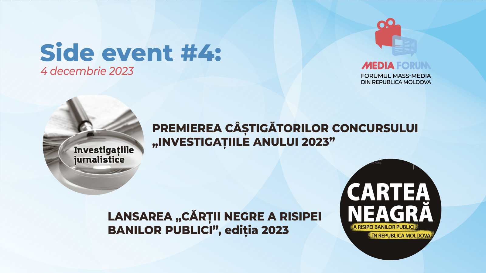 Tradițional la Forumul Media va avea loc lansarea „Cărții Negre a risipei banilor publici”, ajunsă la a cincea ediție. „Cartea Neagră” este o culegere de investigații jurnalistice bine documentate despre cazurile de achiziții publice cu încălcarea normelor legale și în situații de conflict de interese, obiecte de infrastructură în care s-a investit ineficient sau cazuri când investițiile europene pentru dezvoltarea Republicii Moldova au fost gestionate fraudulos. În cadrul aceluiași side event vor fi anunțate și rezultatele ediției a șasea a concursului „Investigațiile jurnalistice ale anului”, organizat pentru stimularea meritelor jurnaliștilor de investigație din Republica Moldova în lupta împotriva corupției, a delapidării fondurilor publice și a altor fărădelegi.