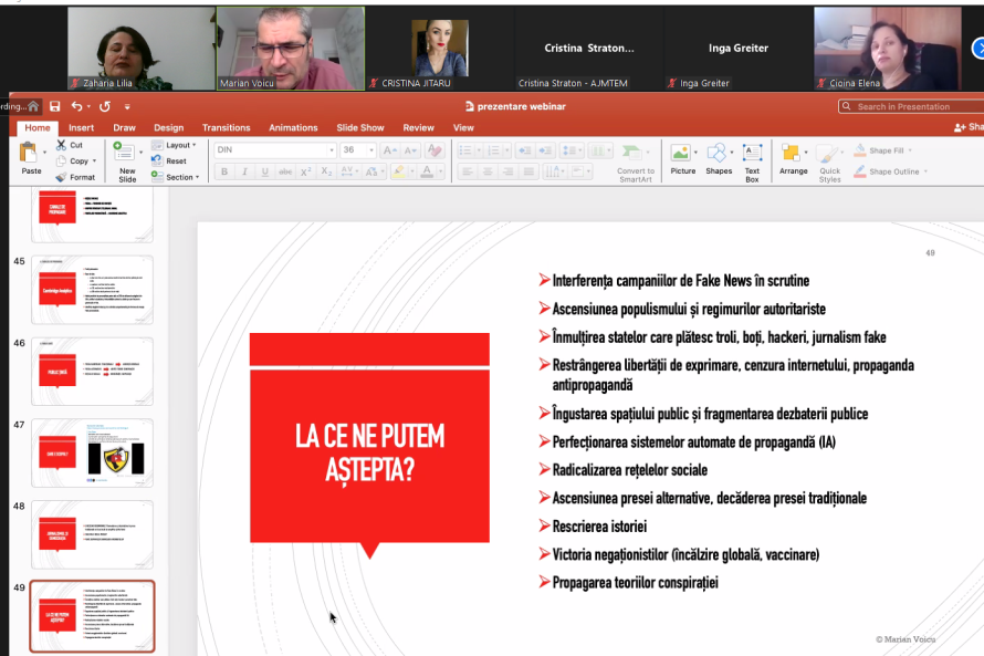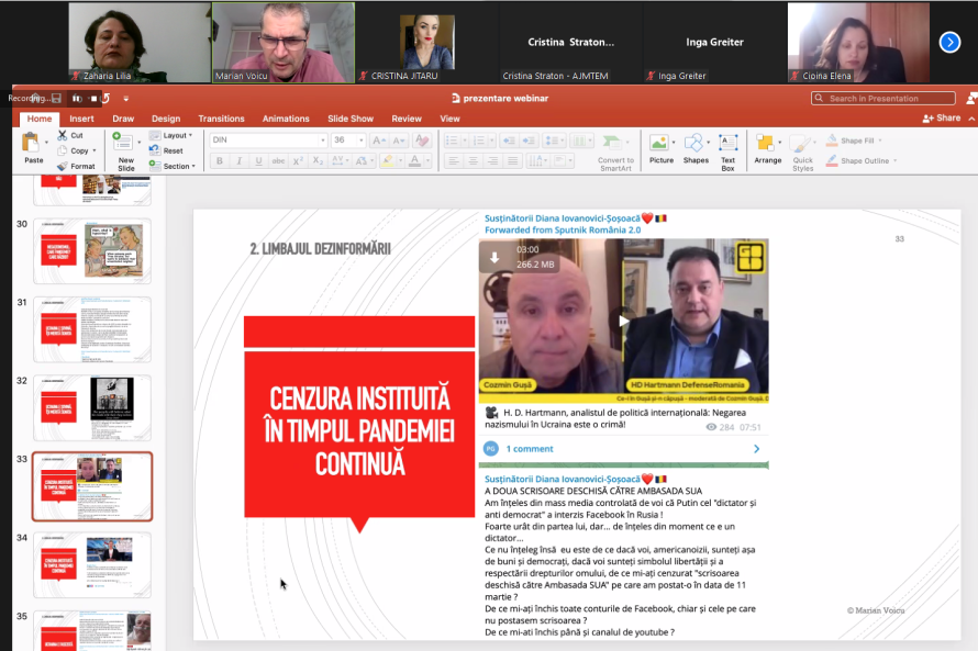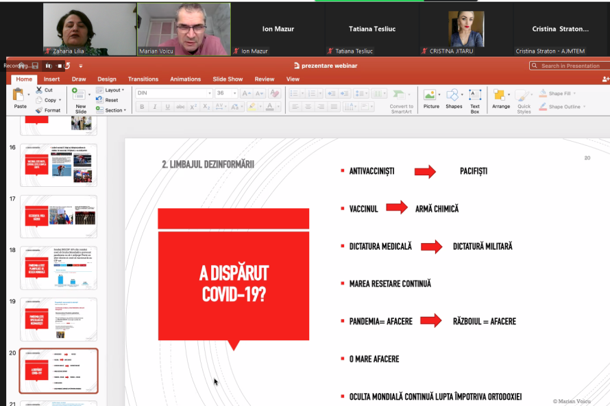 La webinarul desfășurat la 18 martie 2022, jurnalistul român Marian Voicu, realizatorul emisiunii Breaking Fake News!, difuzată la TVR 1, și directorul portalului Veridica.ro, publicație specializată în demontarea campaniilor de dezinformare și manipulare din Europa Centrală și de Est, a analizat mai multe profiluri ale persoanelor publice din România, dar și site-uri care publicau și promovau în perioada pandemiei falsuri și teorii ale conspirației despre noul coronavirus și vaccinare. Deși numărului de infectări de COVID-19 s-a micșorat, totuși teoriile conspirației despre pandemie și vaccinare continuă să fie promovate, a constatat expertul, precizând că redacțiile media și jurnaliștii trebuie să fie foarte atenți, deoarece promotorii dezinformărilor despre noul coronavirus și despre războiul Rusiei împotriva Ucrainei sunt cam aceleași persoane sau platforme media. „Din punctul meu de vedere, anti-vacciniștii s-au transformat astăzi în pacifiști, vaccinul – în armă chimică, dictatura medicală – în dictatura militară. Dacă înainte pandemia era considerată de conspiraționiști o afacere, acum războiul este afacere în opinia acestora. Și în pandemie și acum este prezentă narațiunea că „oculta mondială” continuă lupta împotriva ortodoxiei, din acest motiv conspiraționiștii văd acest război al Rusiei ca fiind unul legitim”, a menționat M. Voicu. Expertul a adăugat că Occidentul este prezentat de conspiraționiști drept unul malefic, atât în vremea pandemiei, cât și în perioada războiului Rusiei împotriva Ucrainei.