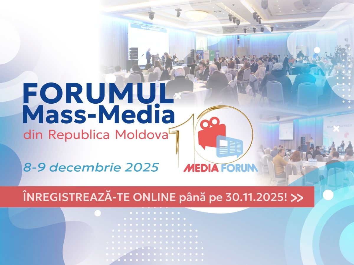 Consiliul de Presă anunță înregistrarea participanților la a 10-a ediție a Forumului Mass-Media din Republica Moldova, care va avea loc pe 8 și 9 decembrie 2025 la Chișinău. Înregistrarea are loc pe pagina web www.MediaForum.md și va continua până pe 30 noiembrie 2025.